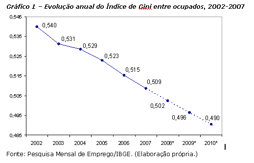 O presidente do Ipea, Marcio Pochmann, informou que o levantamento mostra a queda do índice de Gini, que é o parâmetro internacional para medir a desigualdade. “O índice de Gini vai de zero a 1, quanto maior ele é, mais próximo está da desigualdade extrema”, disse. Pochmann afirmou que “até o final do mandato do presidente Lula o índice de Gini deve chegar a 0,49, o menor desde 1960”. O levantamento mostra, conforme tabela abaixo, que o Índice de Gini caiu de 0,540 em 2002 para 0,509 em 2007.