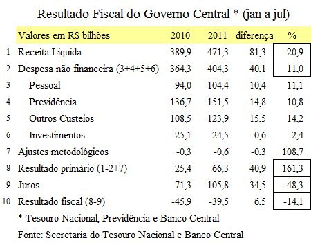 Esse quadro apresenta para os primeiros sete meses de 2010 e 2011, a evolução da Receita Líquida (receita menos as transferências a estados e municípios), das despesas, juros, resultado primário e resultado fiscal (resultado primário menos os juros). A coluna “diferença” é o valor de 2011 menos o de 2010 e o percentual (%) é o quanto evoluiu no período. Assim, a Receita Líquida passou de R$ 389,9 bilhões em 2010 para R$ 471,3 bilhões em 2011 com crescimento de R$ 81,3 bilhões ou 20,9%. O Resultado Primário cresceu 161,3% e o déficit fiscal foi reduzida em 14,1% (última linha e coluna).