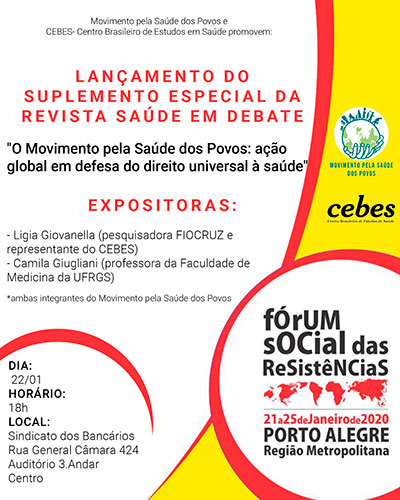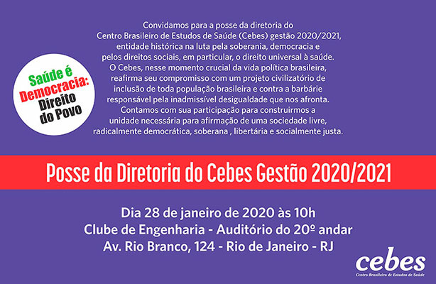 Convidamos para a posse da diretoria do Centro Brasileiro de Estudos de Saúde (Cebes) gestão 2020/2021, entidade histórica na luta pela soberania, democracia e pelos direitos sociais, em particular, o direito universal à saúde.