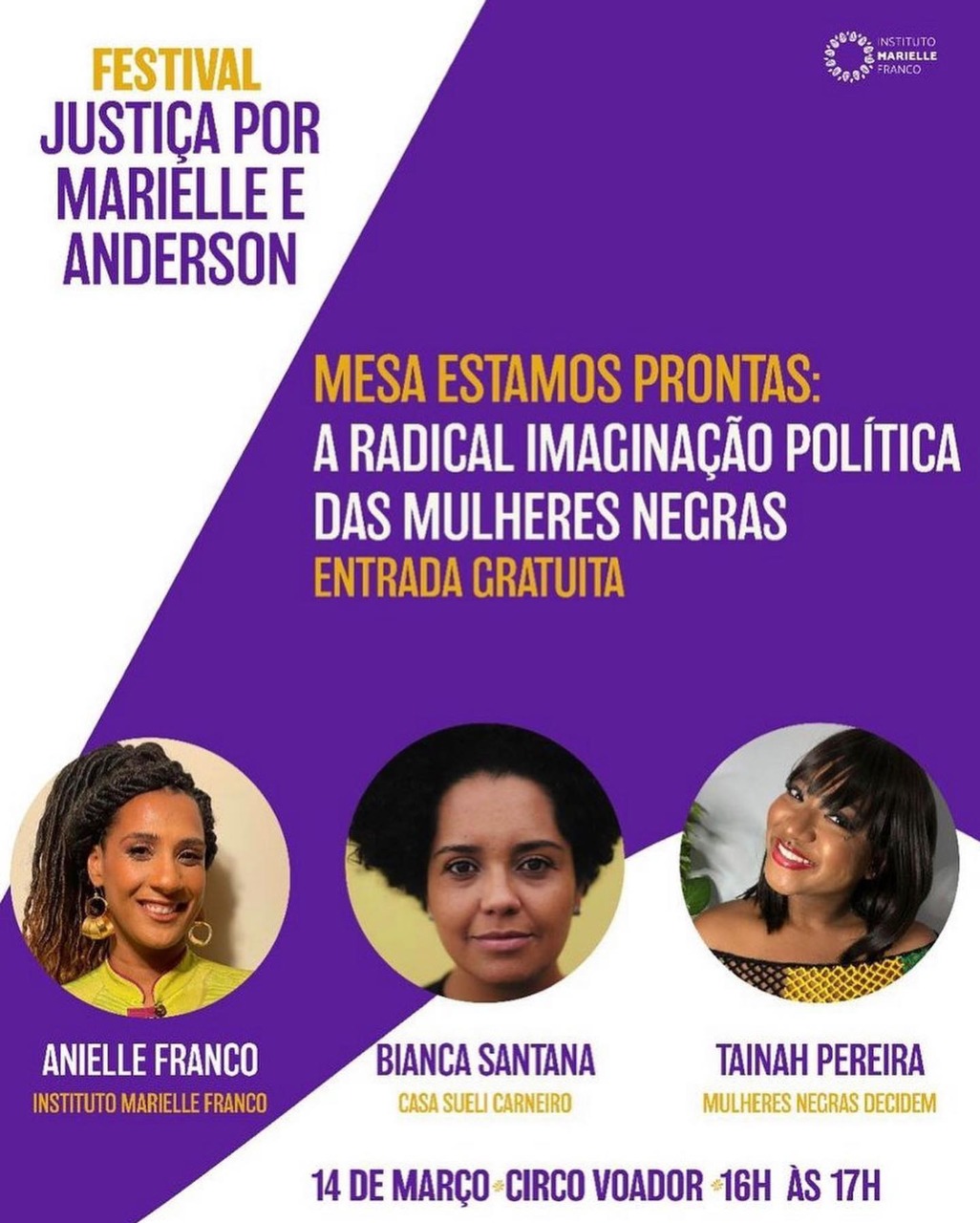 Essa segunda-feira, 14 de março, dia em que se completam quatro anos da execução da vereadora Marielle Franco e do motorista Anderson Gomes, o Instituto Marielle Franco realiza o Festival Justiça Por Marielle e Anderson, no Circo Voador, Rio de Janeiro. O evento contará com apresentações de diversos artistas, rodas de conversa e oficinas, além de um espaço recreativo para crianças. O Festival terá entrada gratuita, mediante a apresentação do comprovante de vacinação contra Covid-19.