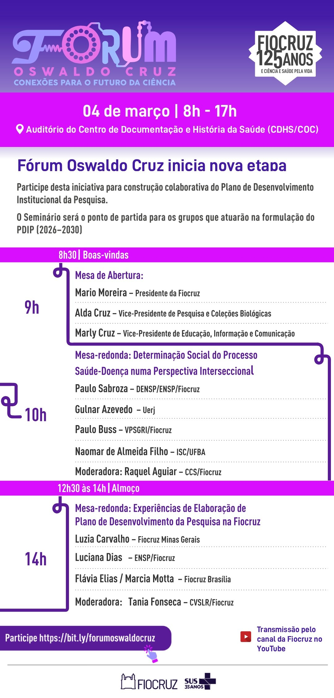 A nova etapa do Fórum Oswaldo Cruz tem início com a realização do seminário ‘Determinação social do processo saúde-doença numa perspectiva interseccional’, que acontece no dia 4 de março, das 8h às 17h, no auditório do Centro de Documentação e História da Saúde (COC/Fiocruz), com transmissão pelo canal da Fiocruz no YouTube. A temática escolhida busca aprofundar os debates que contribuirão para a elaboração do Plano de Desenvolvimento Institucional da Pesquisa da Fiocruz. A iniciativa está inserida na agenda de celebração dos 125 anos da Fundação.