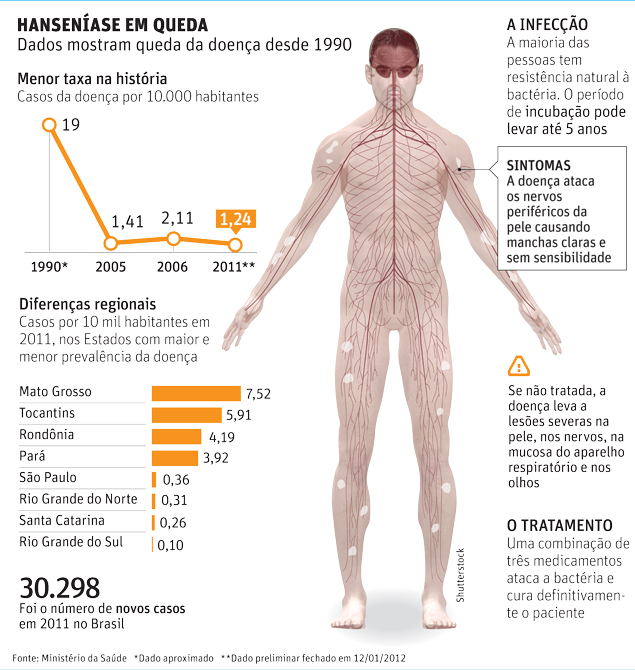 Apesar de vários indicadores apontarem para a redução da doença no país -foram 30.298 novos casos no ano passado, 15% a menos que em 2010-, o Brasil mantém o segundo maior registro de novos casos da hanseníase, só perdendo para a Índia.