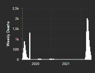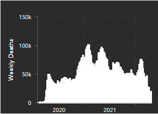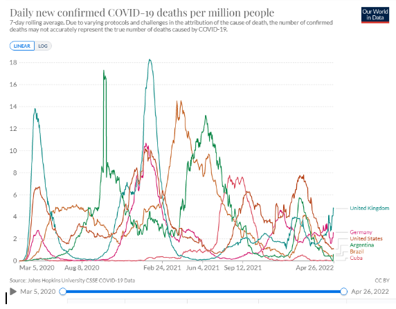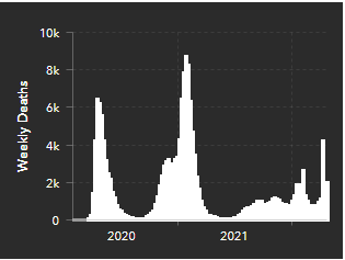 A Inglaterra registrou em maio de 2022 um pico de quatro mil mortes semanais por COVID-19, depois da regressão da mortalidade no continente Americano em fevereiro do mesmo ano.
