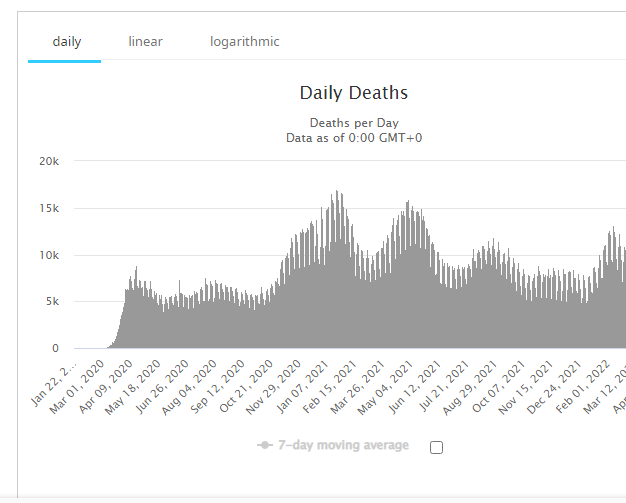 É possível visualizar uma “5ª Onda” de mortes mundiais por COVID-19 decrescendo a partir de meados de fevereiro de 2022. Fonte: JHU – COVID-19 Map – Johns Hopkins Coronavirus Resource Center (jhu.edu) [ https://coronavirus.jhu.edu/map.html ]s Coronavirus Resource Center (jhu.edu)