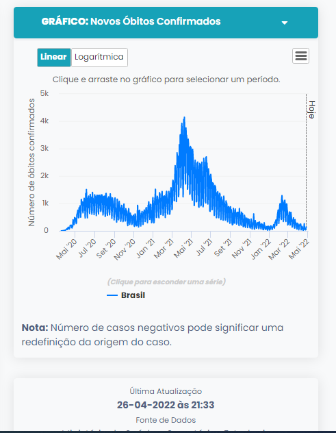 Em 27Abril2022 o Brasil notificou 662.941 pessoas mortas por COVID-19 contados e oficialmente notificadas. Também neste dia são estimados 303 mil casos ativos e um índice de testes abaixo da média dos países de todo o mundo. A taxa bruta de mortalidade por COVID-19 no Brasil é de 3,07 por mil habitantes. É superada pelo Peru (6,2), Romênia (3,4) e Hungria (4,8).