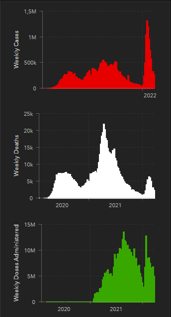 A mortalidade do pico de fevereiro-março de 2022 tem medias móveis diárias de 5 mil mortos no mundo, comparada às médias móveis dos picos anteriores de até dez mil mortos por dia.
