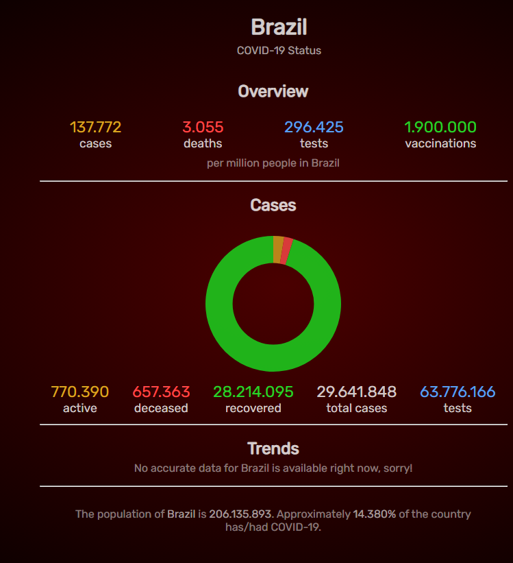 O Brasil vive a realidade mundial de ser o terceiro país no mundo com maior número de casos, com pior índice de testes do mundo com acesso à tecnologia (290 mil por milhão de habitantes são testados), e com maior número de mortos (3 mil por milhão de habitantes). A letalidade ou número de mortos pela doença na última semana continua desaparecida dos indicadores mundiais por que o Brasil, no “apagão de dados da saúde” é considerado não confiável.