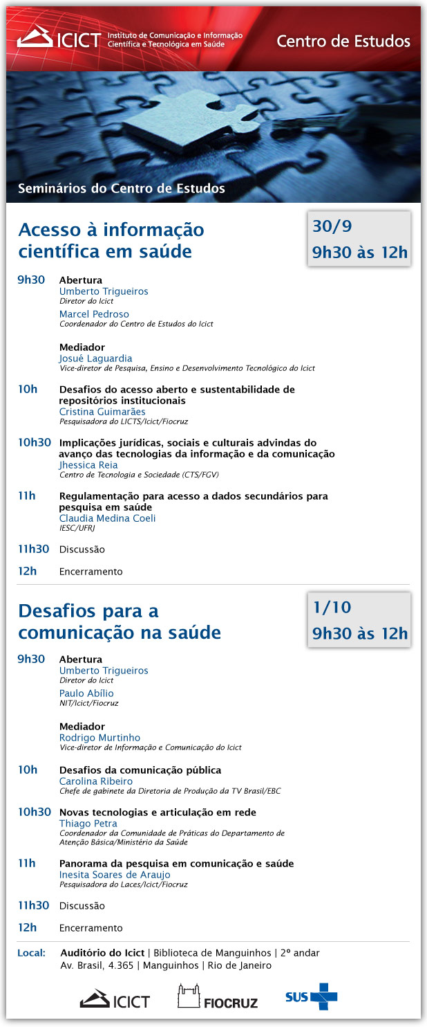 Veja também a matéria sobre o Centro de Estudos e a programação dos seminários site do Icict.