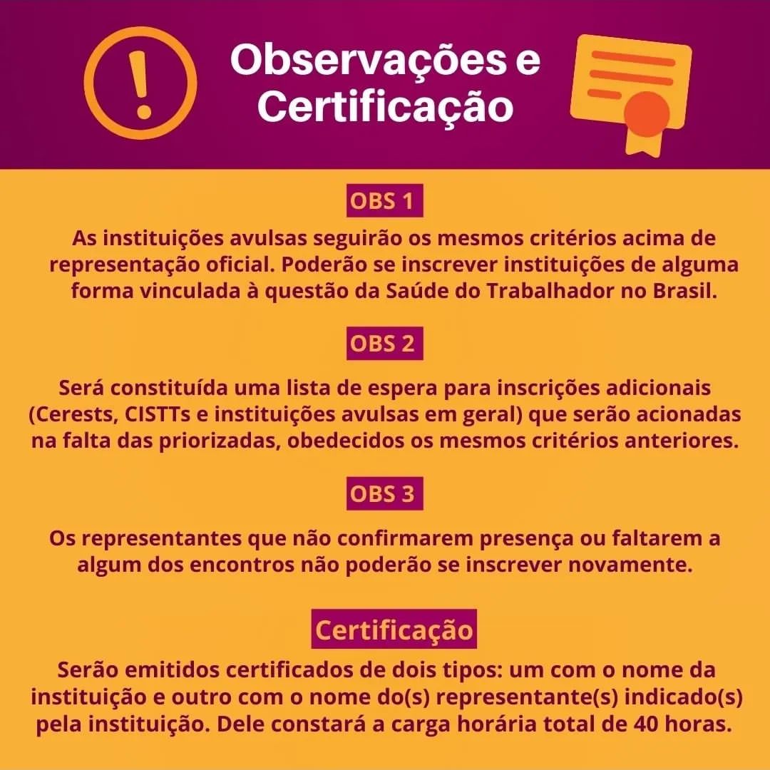 - Após a realização da inscrição, as Cistts, os Cerests e demais instituições inscritas assumem o compromisso de participar de TODOS os encontros nos dias e horários estabelecidos para obter a certificação.