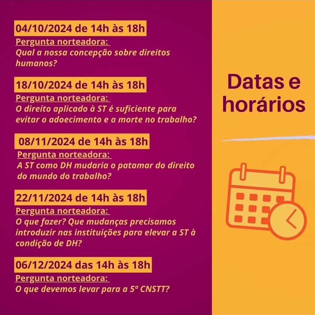 – 3º Encontro: 08/11/2024 de 14h às 18h; – A ST como DH mudaria o patamar do direito do mundo do trabalho?
