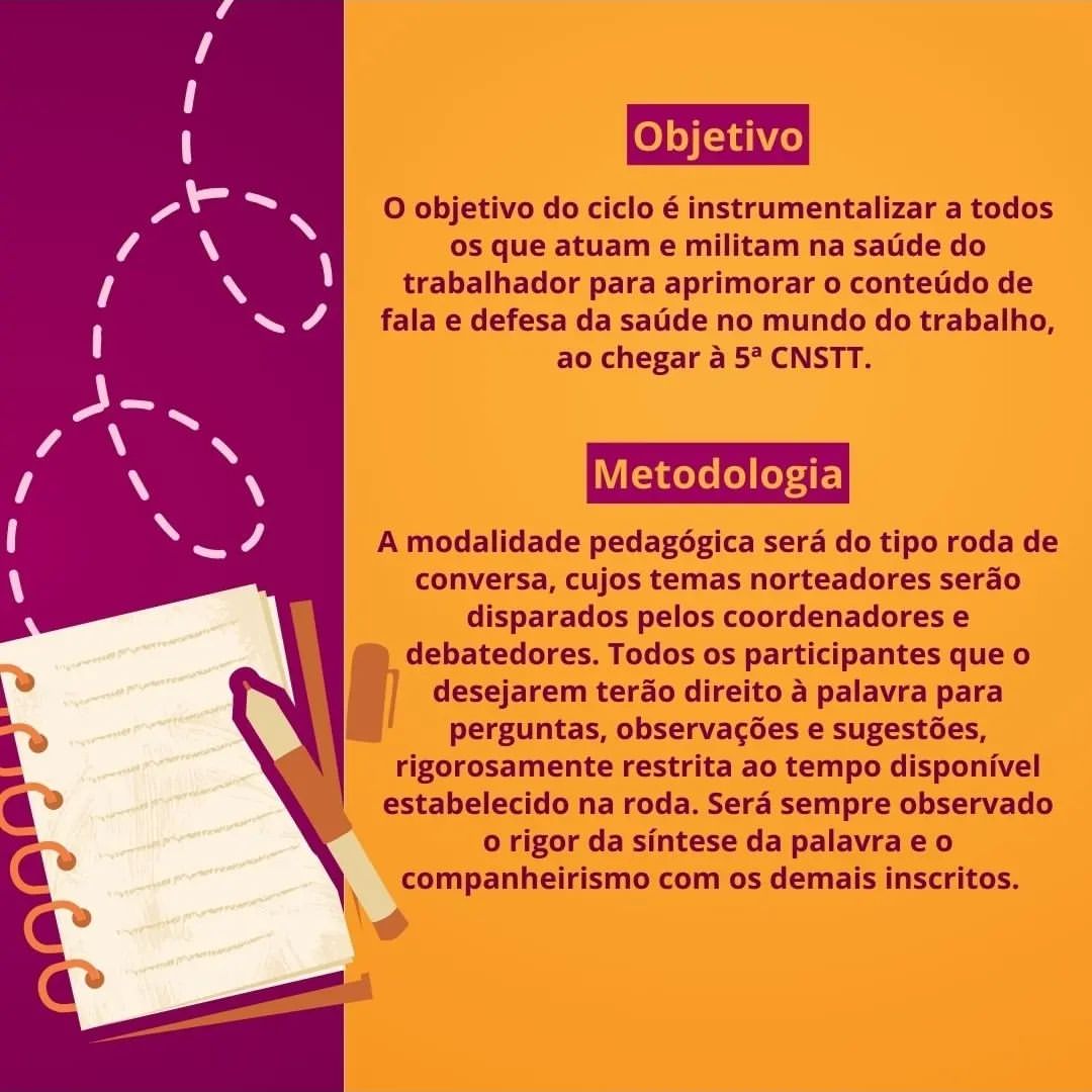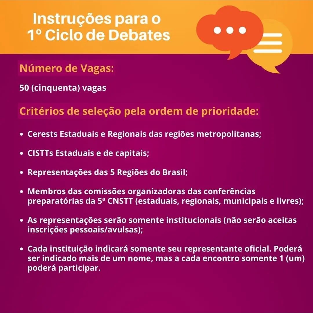 O Ciclo de Debates é uma iniciativa intersetorial preparatória para os debates que ocorrerão na 5ª CNSTT em Brasília em julho de 2025. É organizado em 5 encontros, em modo virtual, priorizando instituições que deverão estar representadas com delegados na 5ª CNSTT.