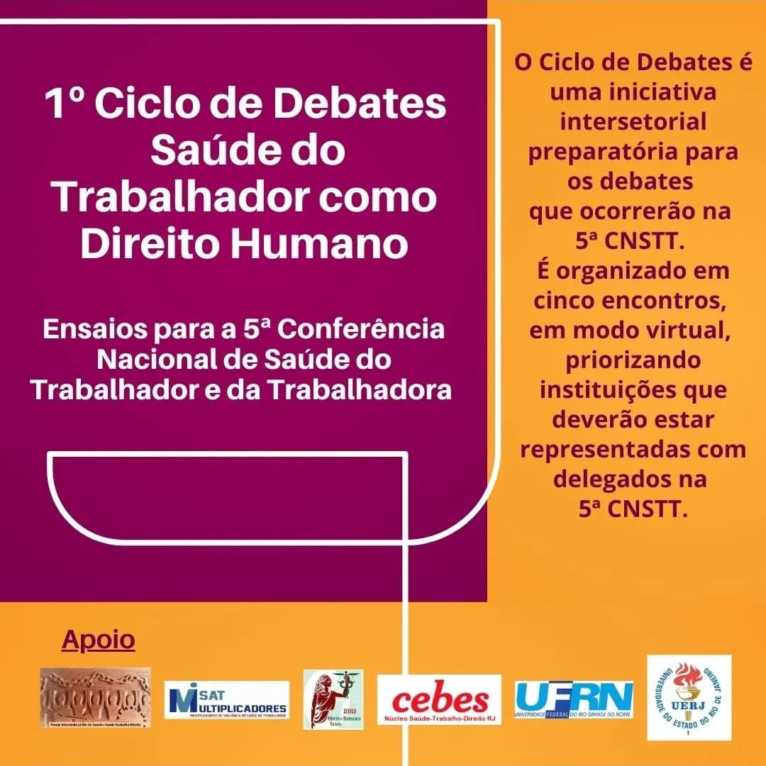 O Núcleo Saúde-Trabalho-Direito do CEBES convida para o 1º Ciclo de Debates Saúde do Trabalhador como Direito Humano: Ensaios para a 5ª Conferência Nacional de Saúde do Trabalhador e da Trabalhadora que acontece a partir 04/10.
