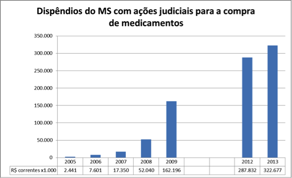 Em recente e estimulante debate no Rio de Janeiro, promovido pela Escola de Magistratura, houve a sugestão de que o crescimento do número e do valor das ações vem diminuindo ou, no mínimo parando de crescer. Além disso, que o contorno formal das mesmas estaria em processo de transformação, das ações privadas (individuais) para as ações civis públicas (coletivas) e, no que se refere ao seu conteúdo, das ações para o acesso a medicamentos para o acesso a outros serviços e produtos de saúde. Não é simples a verificação dessas três sugeridas modificações de perfil. Quanto à primeira delas, entretanto, tomando como índice apenas o Ministério da Saúde que, aliás, não é o destinatário mais importante das ações (que são os estados) e levando em conta o valor dos dispêndios com ações judiciais apenas para a compra de medicamentos, os números atualizados estão no gráfico abaixo (1) . Como podemos observar, eles não confirmam a cogitada tendência à diminuição ou estabilização do número de ações, indicador possível de uma ‘pacificação’ do tema. Os números de 2013 referem-se a ações até 31 de julho. Expandimos a mesma para 12 meses.