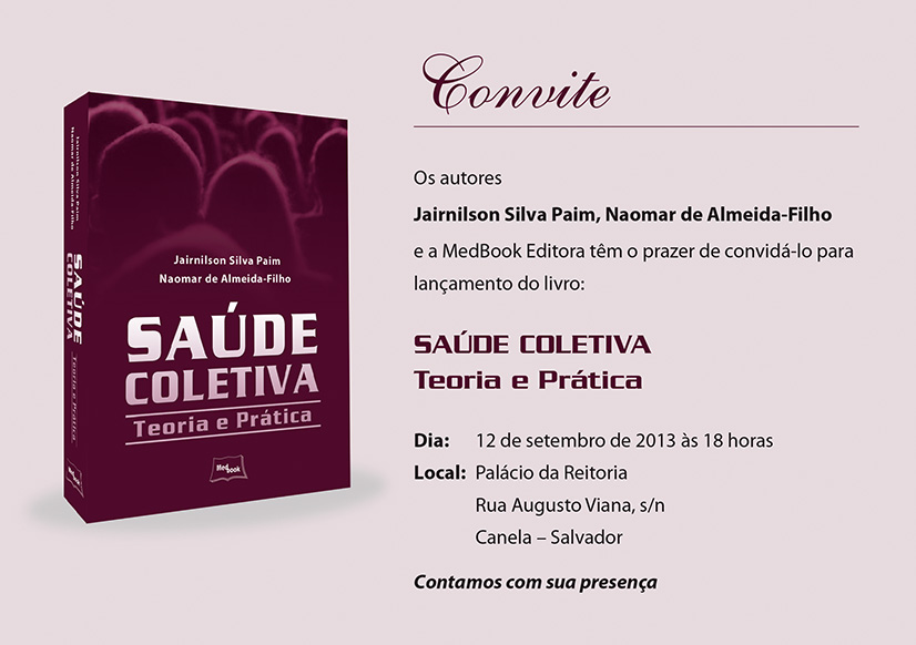 Os autores Jairnilson Silva Paim e Naomar de Almeida Filho, professores do Instituto de Saúde Coletiva da UFBA, convidam para o lançamento da obra no dia 12 de setembro de 2013, às 18 horas, no Palácio da Reitoria, Rua Augusto Viana S/N, Canela Salvador(BA).
