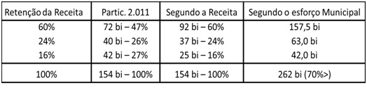 O melhor referencial da procedência desse compromisso governamental é o quadro comparativo elaborado por Gilson Carvalho, revelando as alterações das parcelas de cada esfera de governo no financiamento do SUS, (Federal, Estadual e Municipal) em duas circunstâncias: corresponder à participação na retenção da receita (terceira coluna) e reproduzir nas outras esferas, o esforço municipal de colocar no SUS o porcentual que vem colocando dos impostos municipais (quarta coluna).