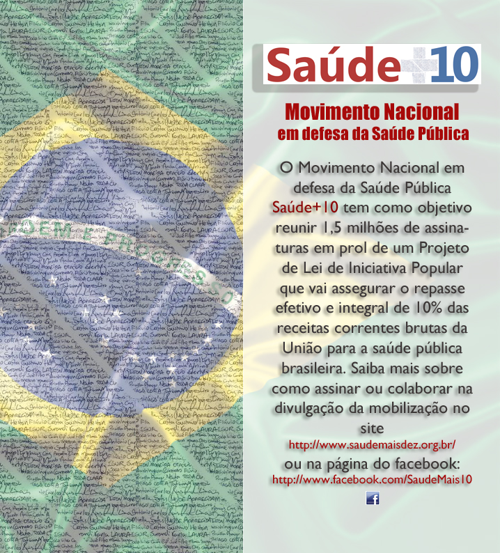 Acesse o site oficial da campanha: www.saudemaisdez.org.br ou a página oficial do Facebook, e saiba como participar e recolher assinaturas!