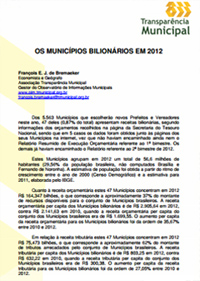 Estudo chamado “Os municípios bilionários em 2012”, do economista e geógrafo François E. J. de Bremaeker, gestor do Observatório de Informações Municipais, integrante da Associação Transparência Municipal, mostra que dos 5.563 Municípios que escolherão novos Prefeitos e Vereadores neste ano, 47 deles (0,87% do total) apresentam receitas bilionárias.