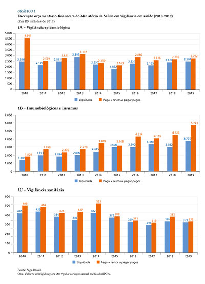 No gráfico 1, apresentam-se as despesas liquidadas e a soma das despesas do exercício pagas e dos restos a pagar pagos no exercício. Nota-se redução das despesas com vigilância sanitária e manutenção no mesmo patamar das despesas liquidadas com vigilância epidemiológica entre 2010 e 2019, que passaram de R$ 2.516 milhões para R$ 2.504 milhões a preços constantes. Ressalta-se o volume elevado de pagamento de despesas com vigilância epidemiológica em 2010. Em 2009, o Brasil enfrentou a pandemia pelo vírus Influenza (H1N1), o que contribuiu para gerar um volume expressivo de despesas inscritas em restos a pagar, as quais foram pagas em 2010.