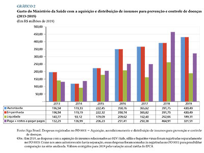 Destaca-se das despesas com imunobiológicos, os gastos com a aquisição, o acondicionamento e a distribuição de insumos para prevenção e controle de doenças (gráfico 2). Esses gastos incluem a compra de larvicidas, inseticidas, preservativos, gel lubrificante e kits diagnóstico. Pelo orçamento, não é possível distinguir as despesas realizadas com a compra de kits diagnósticos. O que se pode dizer é que os recursos que foram utilizados para tanto até 2019, foram necessários à aquisição de insumos para a prevenção e o controle de outras doenças que não a Covid-19, tais como, sífilis, hepatites virais, HIV/Aids, malária, tuberculose, hanseníase, entre outras doenças. Portanto, estão relacionados a doenças endêmicas e não endêmicas no Brasil, mas com pouca probabilidade de redução de sua incidência e prevalência no curto prazo, o que deve, no mínimo, manter a demanda por insumos no seu manejo.