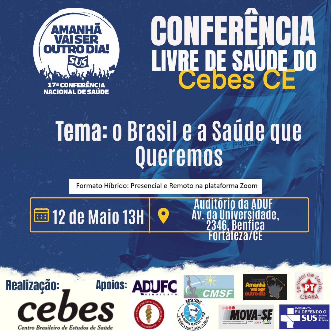 O núcleo Ceará do Cebes promove no dia 12 de maio, das 13h às 17h, a Conferência Livre de Saúde do Cebes no Estado. O evento, que vai contar com a presença do presidente Carlos Fidelis, acontece na da Associação dos Docentes da Universidade Federal do Ceará- ADUF em formato Híbrido, presencial e remoto.