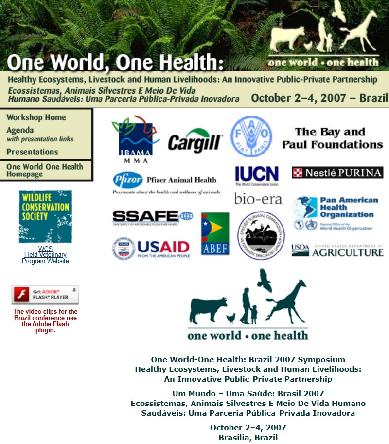 Naquela primeira década do século XXI, o Brasil também sediou encontros de difusão da One Health. É interessante observar, em folder destacado pelo artigo e reproduzido abaixo, quais eram as entidades e empresas que apoiavam o evento One World, One Health, em outubro de 2007: entre outras, Cargill, Pfizer, Nestlé e USAID…