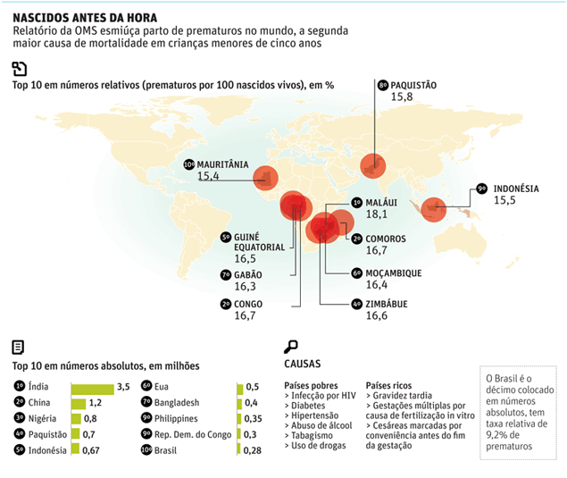 No Brasil, a taxa é de 9,2%, a mesma da Alemanha. No entanto, em números absolutos, o país foi o décimo com mais prematuros entre os 185 listados, com 279,3 mil nascimentos em 2010.