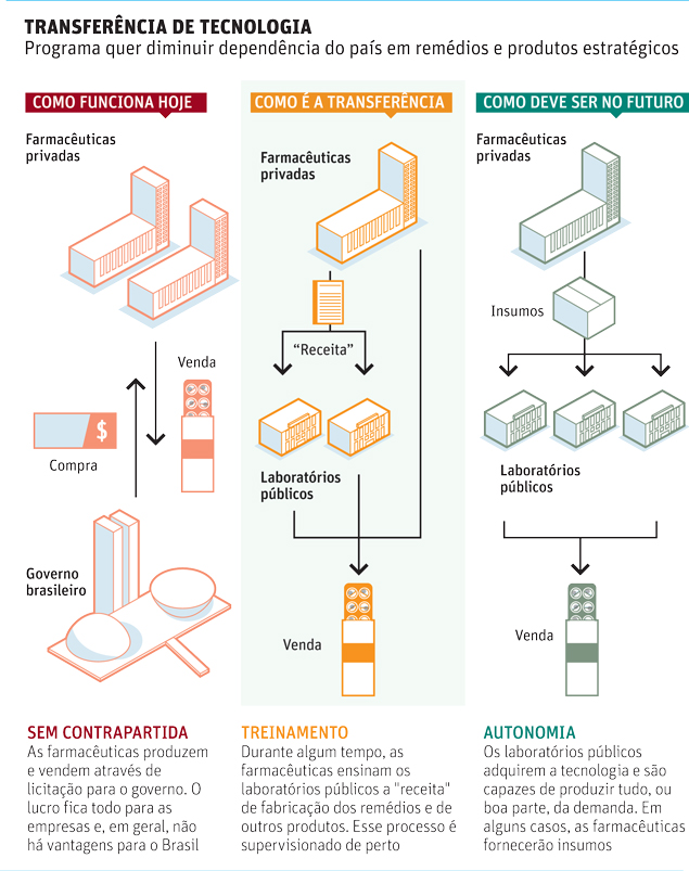 O Ministério da Saúde rebate a crítica. “Os laboratórios não estão sobrecarregados. Pelo contrário, esse programa tem uma perspectiva de desenvolvimento regional muito interessante. Há um movimento forte de renascimento de laboratórios públicos, que estavam acabando na década de 1990”, afirmou Carlos Gadelha, secretário de Ciência Tecnologia e Insumos Estratégicos da pasta.