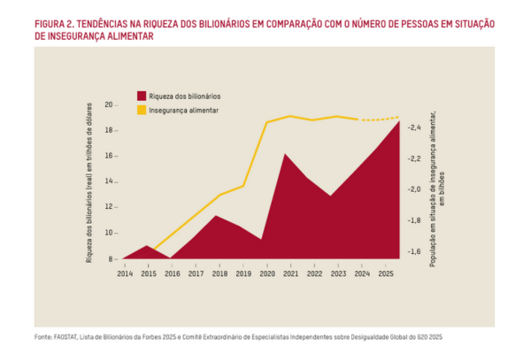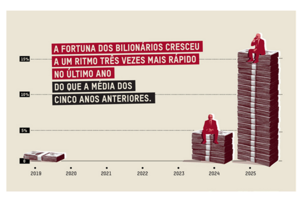 Em 2025 a concentração de riqueza dos bilionários cresceu três vezes mais rápido que a média dos últimos cinco anos. Enquanto 25% da população mundial não tem acesso regular à alimentação suficiente, a riqueza dos bilionários aumentou 81% desde 2020.