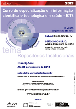 Estão abertas, até 21 de fevereiro, as inscrições para a seleção do curso de especialização lato sensu em Informação Científica e Tecnológica em Saúde (ICTS/Icict/Fiocruz). Em 2013, o curso terá como tema “Repositórios Institucionais”, com foco nos quatro eixos que compõem o curso: “acesso”, “organização”, “comunicação e usos” e “aplicações da informação científica e tecnológica”.