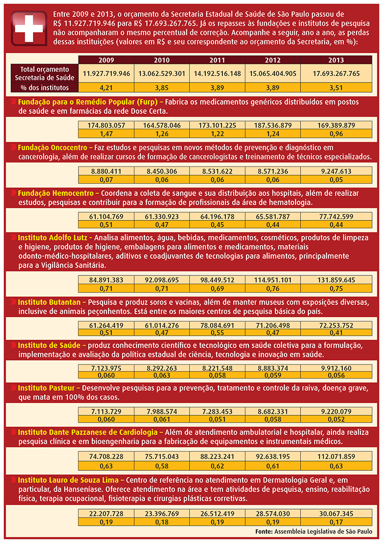 Entre 2009 e 2013, os institutos de pesquisa e fundações ligadas à Secretaria Estadual de Saúde de São Paulo perderam cerca de 17% de seu orçamento em relação ao montante repassado à pasta, que foi corrigido em 48,3% no período. Em 2009, correspondiam a 4,21%, caindo para 3,51% em 2013.