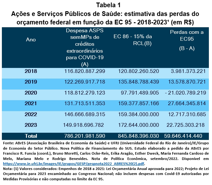 Segundo estudo da Associação Brasileira de Economia da Saúde (ABrES), foram retirados do SUS cerca de R$ 37 bilhões de 2018 a 2022. E, em 2023, serão retirados aproximadamente mais R$ 23 bilhões, considerando os valores do PLOA 2023. Um total acumulado de R$ 60 bilhões (Veja Tabela 1).