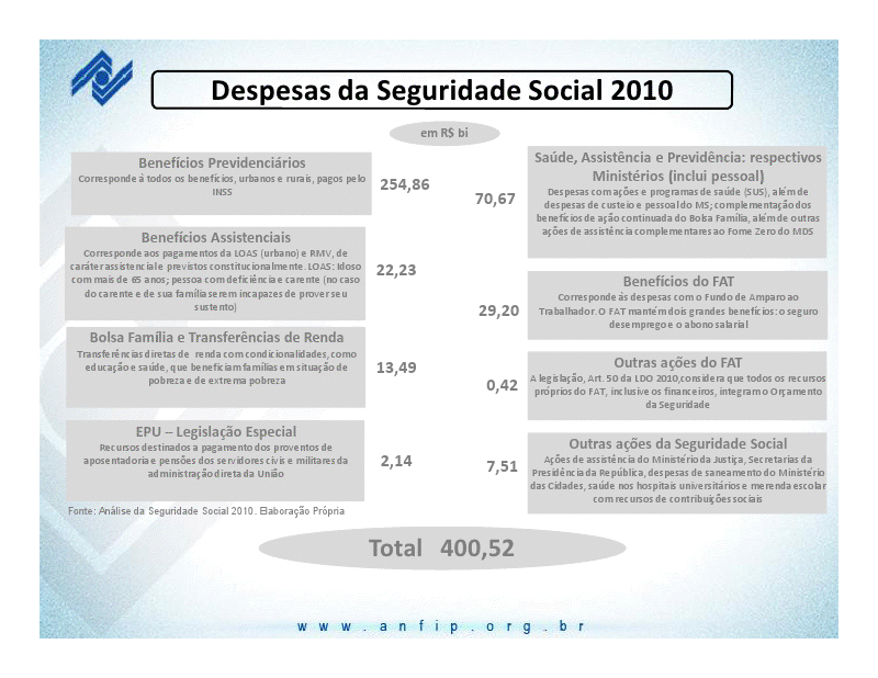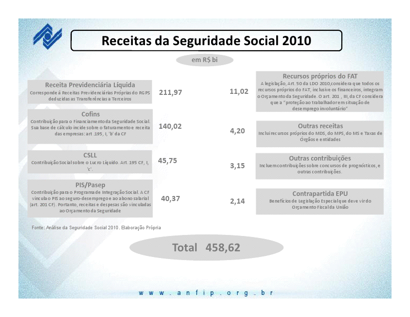 Veja abaixo como a Associação Nacional dos Auditores Fiscais da Receita Federal do Brasil calcula as receitas e despesas da Seguridade Social. Em seguida, acesse o link para o download do Termo de Referência do Simpósio, que reúne vários outros dados.