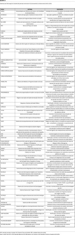 Sistemas de Informação em Saúde (SIS) são instrumentos que, por meio do processamento de dados coletados em serviços de saúde e outros locais, dão suporte à produção de informações para a melhor compreensão dos problemas e tomada de decisão no âmbito das políticas e do cuidado em saúde 1. No Brasil, quando esses sistemas têm abrangência nacional são chamados de fontes de dados nacionais sob a gestão do Sistema Único de Saúde (SUS) 2, SIS de abrangência nacional 3 ou de base nacional 4, ficando a custódia dos dados e a manutenção de software geralmente sob a responsabilidade do Ministério da Saúde.