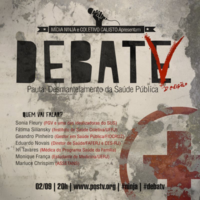 Hoje a ex-presidenta do Cebes, Sonia Fleury, participará do #DEBATV, uma parceria entre o Coletivo Calisto e Mídia NINJA. Será o segundo programa de uma série que tem como objetivo discutir as principais bandeiras levantadas nas manifestações junto ao movimento civil. A pauta dessa segunda será O desmantelamento e a privatização da Saúde e a atual situação do SUS. O programa será transmitido ao vivo no site www.postv.org, a partir das 20 horas.