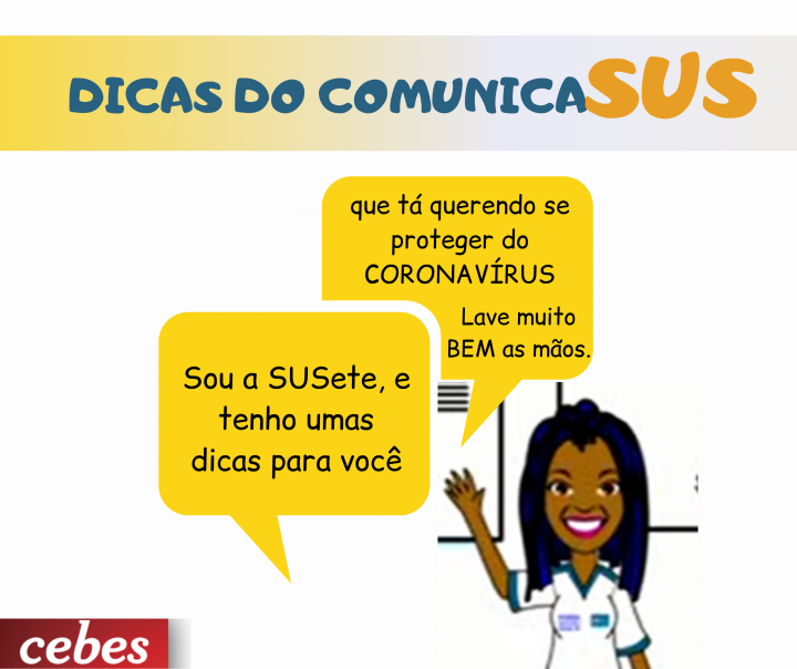 A SUSete, agente de saúde e personagem do projeto ComunicaSUS, também está engajada na luta contra a pandemia do Covid-19. A CRIAR Brasil, em parceria com o CEBES e apoio da organização Médico Internacional, criou peças gráficas e sonoras para divulgar algumas práticas de prevenção contra o coronavírus.