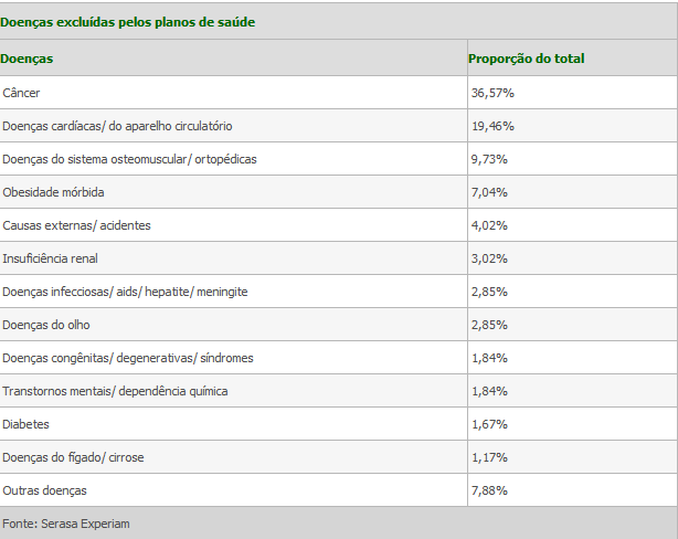 Para Scheffer, conforme publicado pela Agência USP, a negativa de cobertura se dá pelo alto custo do tratamento. Abaixo, as doenças cujos tratamentos são mais excluídos dos planos de saúde, conforme análise de 596 citações de ações judiciais: