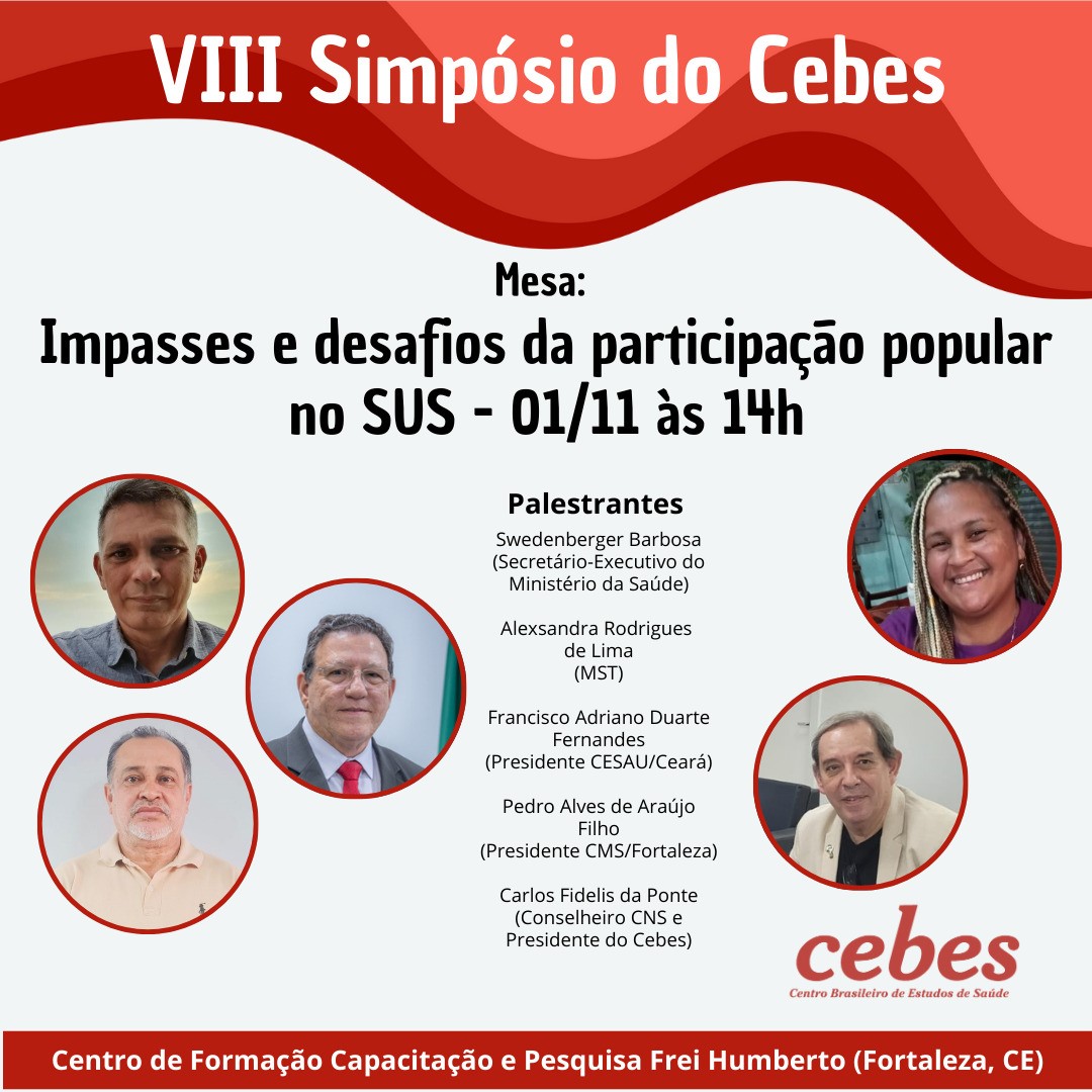 O VIII Simpósio do Centro Brasileiro de Estudos de Saúde (Cebes), realizado em Fortaleza nesta quinta e sexta-feira (31/10 e 1°/11), terá transmissão ao vivo. O evento reunirá pesquisadores, gestores, ativistas e lideranças da sociedade civil no Centro de Formação Frei Humberto (rua Paulo Firmeza, nº 445 – São João do Tatuapé – Fortaleza). Acompanhe as discussões pelo canal do YouTube do Cebes.