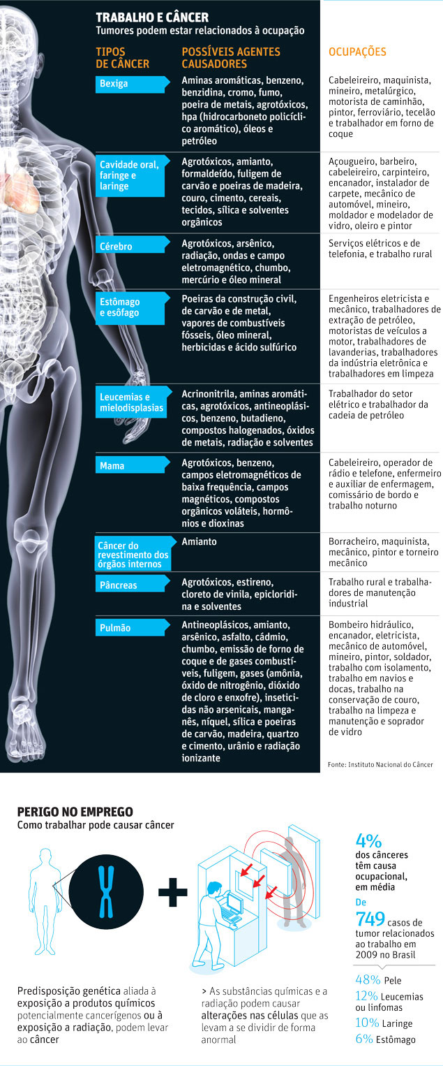 Estimativa do Inca (Instituto Nacional de Câncer) baseada em estudos internacionais mostra que cerca de 4% das 518.510 pessoas que vão receber diagnóstico de câncer neste ano terão o trabalho como causa da doença.