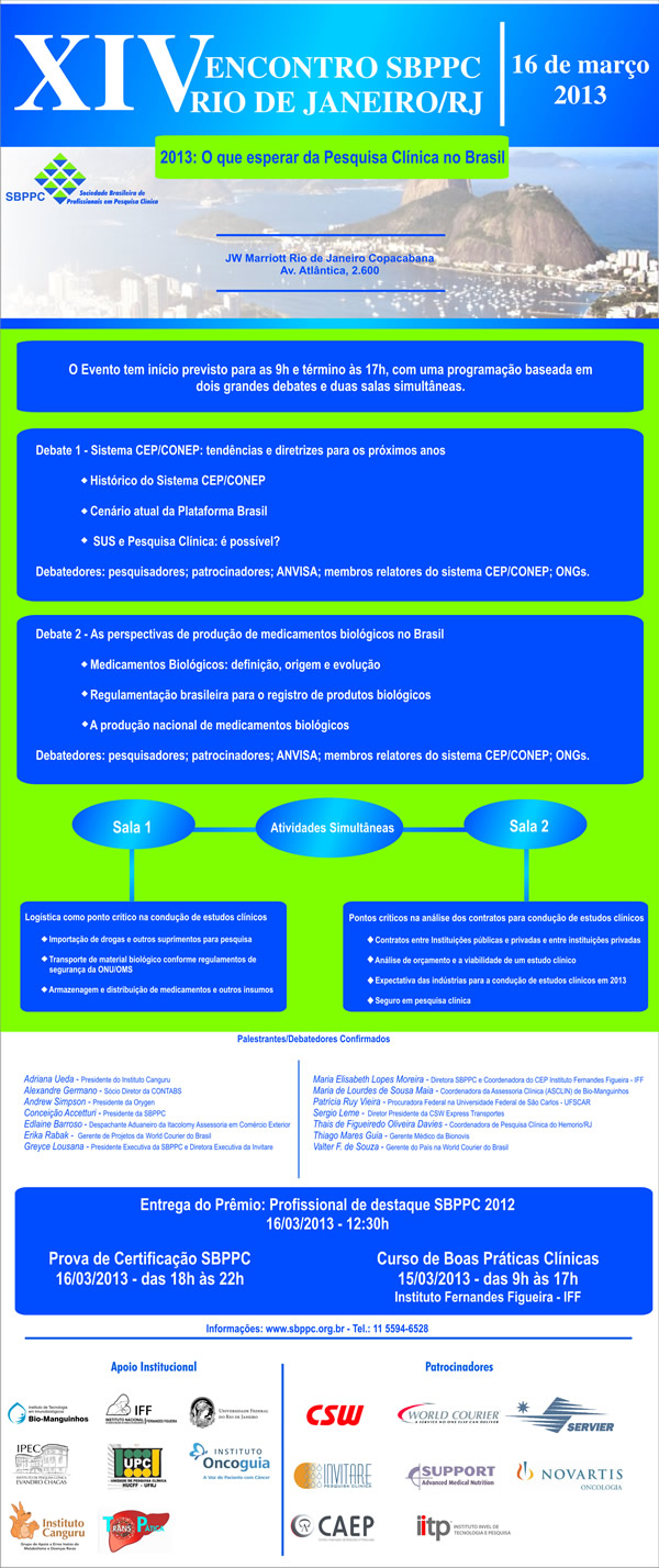 A Sociedade Brasileira de Profissionais em Pesquisa Clínica (SBPPC) realizará, no dia 16 de março de 2013, o XIV Encontro SBPPC, na capital do Rio de Janeiro.