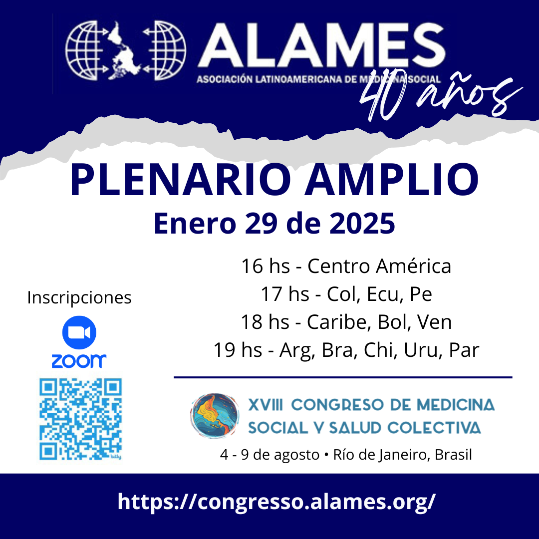 No próximo dia 29, quarta-feira, será realizada uma plenária online para debater os 40 anos da ALAMES e os preparativos para o XVIII Congresso Latino-Americano de Medicina Social e Saúde Coletiva, que acontecerá em 2025 no Brasil.